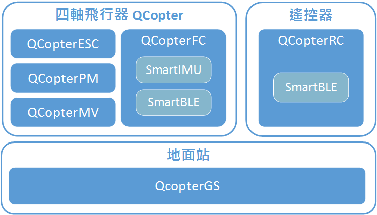 下面是 QCopter 預計要實現的部分,目前先以飛行器和遙控器這兩部分為主。